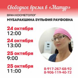 ВРАЧ КОСМЕТОЛОГ МУБАРАКШИНА ЗУЛЬФИЯ РАУФОВНА Свободные дни приема: 24 октября - 12:00 24 октября - 13:00 25 октября - 9:00 25 октября - 11:00 Запись по телефонам: 8-917-267-68-92 8-906-119-40-72